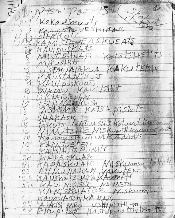 For his part, Pinip Rich could easily recite over 300 Innu places names by heart, and was an excellent map reader. Pinip was proud of this knowledge of Innu place names and was truly one of the great experts in the village on this topic. He kept notebooks in which he wrote lists of names for the lakes, rivers, and mountains in the territory. Here is an example of some names from one of his lists.