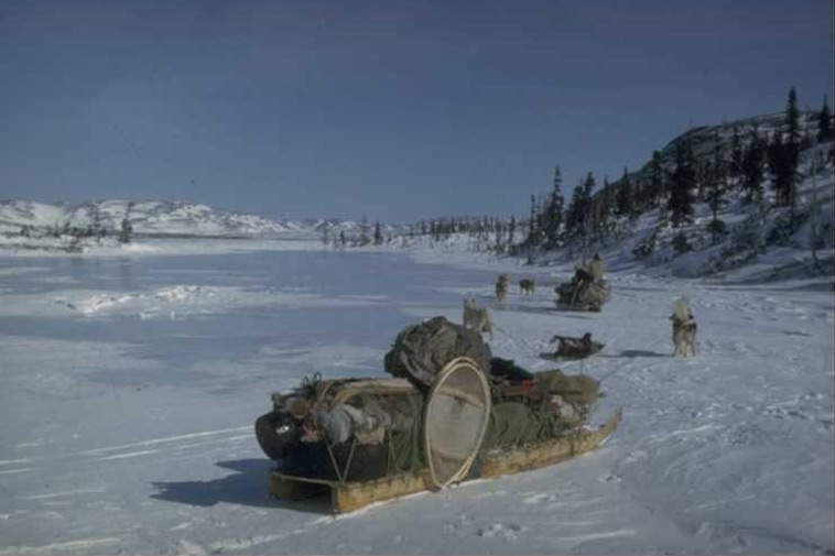 Mishtikushuss' (Georg Henriksen) komatik and dog team at Kapashkuat. Note the skis and snowshoes tied to the komatik load. Photo courtesy Georg Henriksen.