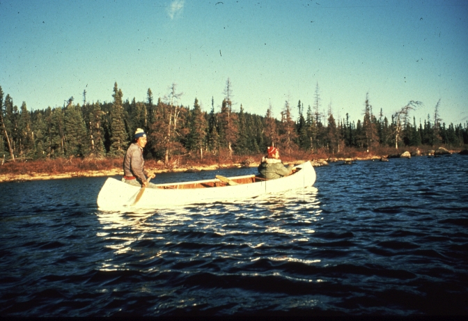 Shushep Mark and the late Ishpashtien Rich canoeing near Enakapeshakamau. Photo Nigel Markham, courtesy Innu Nation.