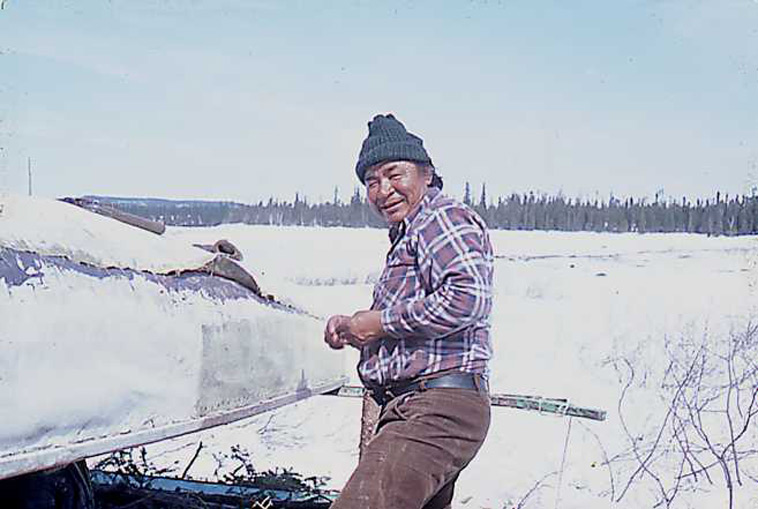 Puniss Nuke repairing his canoe at Ashtunekamiku. Photo courtesy Janet Kergoat.