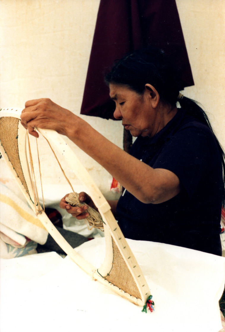 Mani-Aten Penashue laces a snowshoe at Kamashkushkatinau-nipi. Photo courtesy Camille Fouillard.