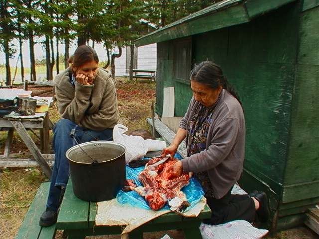 Naissa Penashue butchers a beaver while An-Manikanet Penashue observes. Photo courtesy Peter Armitage.